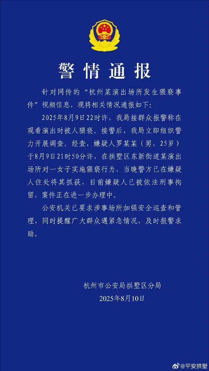 2025年8月9日22时许,我局接群众报警称在观看演出时被人猥亵。接警后,我局立即组织警力开展调查。经查,嫌疑人罗某某(男,25岁)于8月9日21时50分许,在拱墅区东新街道某演出场所对一女子实施猥亵行为,当晚警方已在嫌疑人住处将其抓获,目前嫌疑人已被依法刑事拘留,案件正在进一步办理中。