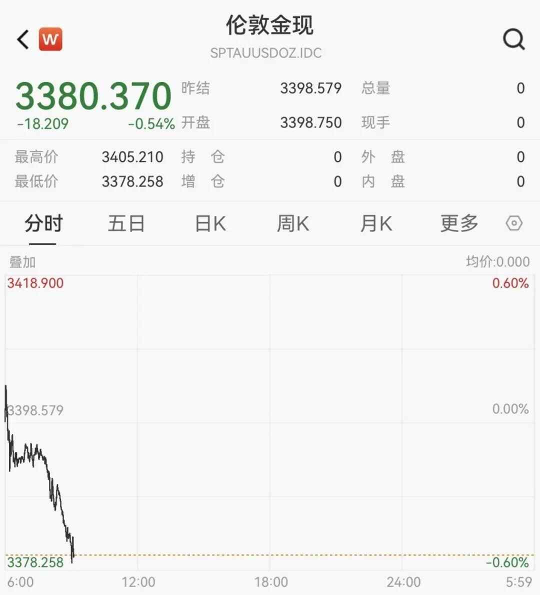 8月11日早盘,现货黄金向上触及3400美元/盎司,随后短线下挫,一度跌超0.6%。