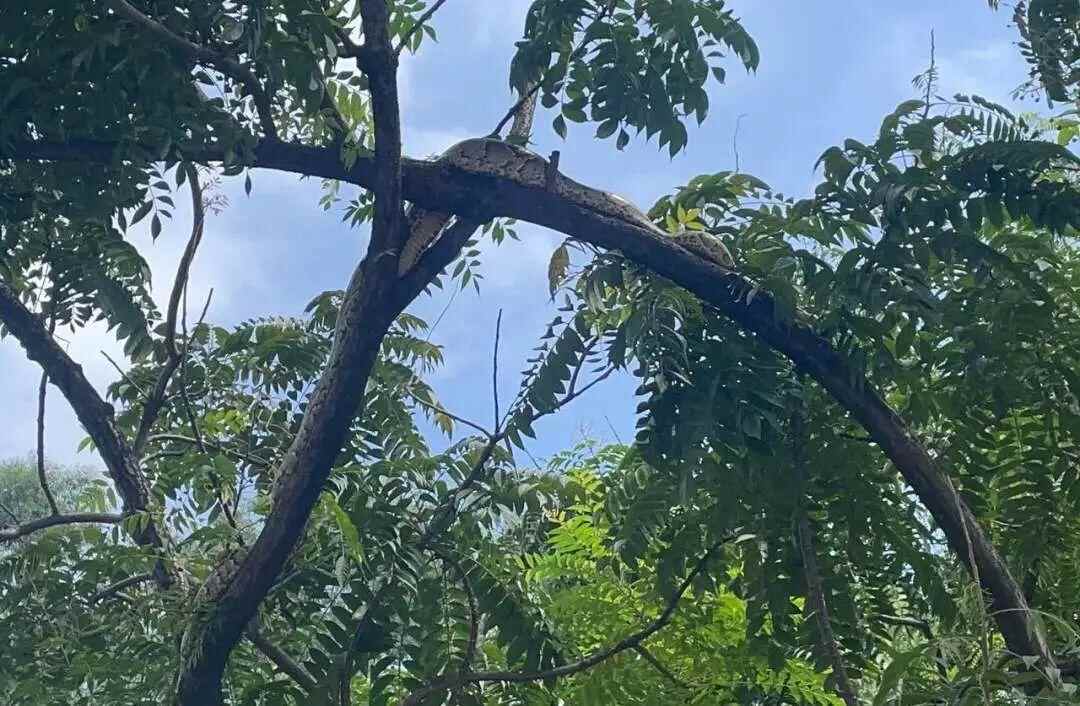 8月10日上午,在佛山市顺德区北滘镇都宁岗公园入口处,一只攀爬上树的巨蟒在晒太阳时被市民发现。市民报警后,当地消防收到了“抓了么”订单,随即赶往蟒蛇所在地捉蛇。