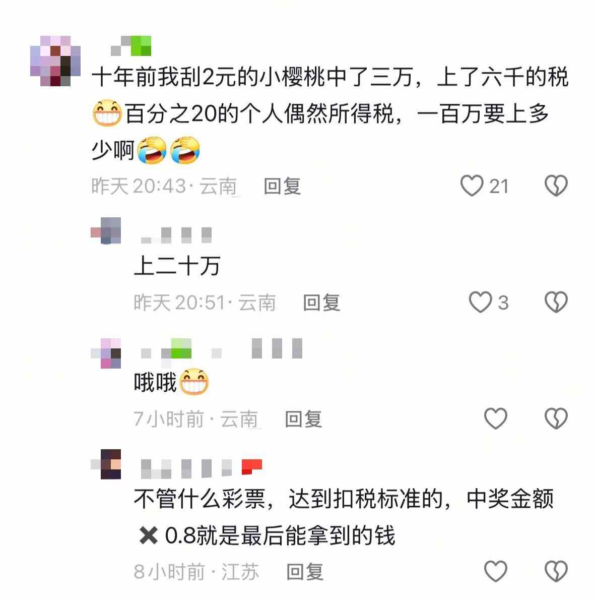 网友在评论区表示羡慕“一夜暴富什么时候轮到我”,也有网友在评论区科普,100万的彩票最后能到手80万。