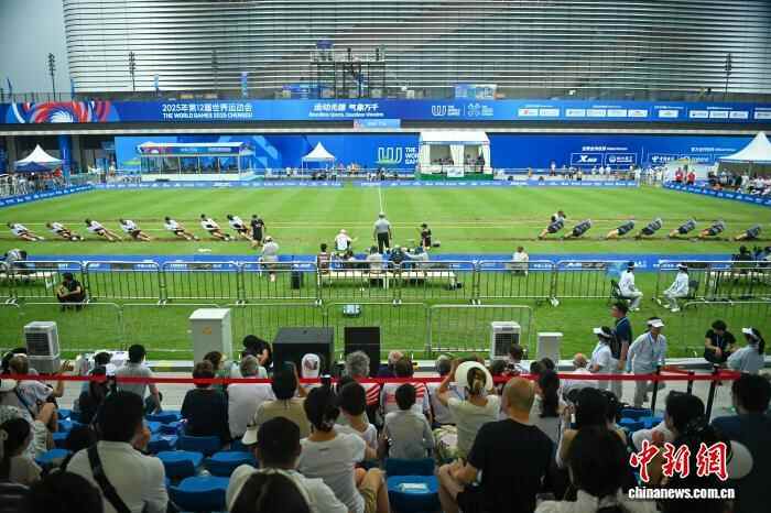 8月9日,2025年成都世运会男子室外拔河640公斤级决赛在东安湖体育公园中央广场进行,拔河比赛吸引众多观众。 中新社记者 刘忠俊 摄