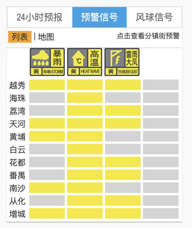 截至8月11日16时25分,广州多区同时发布高温、暴雨和雷雨大风预警信号。其中广州所有行政区皆发布高温黄色预警信号;越秀、天河、增城同时发布暴雨和雷雨大风黄色预警信号;黄埔、南沙发布暴雨黄色预警信号;荔湾、花都、番禺、从化发布雷雨大风黄色预警信号。结合广州市气象台8月11日15时45分发布的短时天气预报,预计11日16时至19时,广州多云,有雷阵雨,局部雨势较大。由于雨势可能会持续至晚高峰,有出行需求的市民需留意天气发展。