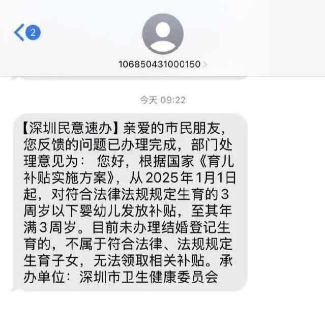 近日,有网友发文反映称,自己收到深圳市卫生健康委短信告知,因其未办理结婚登记而生育,不属于符合法律、法规规定生育子女,无法领取相关育儿补贴,相关帖文立即引起网友热议。