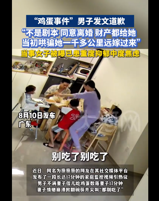 “鸡蛋事件”男子发文道歉:不是剧本,同意离婚,财产都给她。当初哄骗妻子一千多公里远嫁过来,当事女子被曝已患重度抑郁中度焦虑。