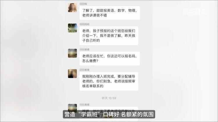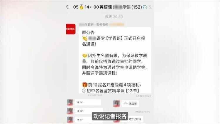 经过几天交流,助教老师开始推介其所在培训机构重点打造的“清北学霸班”,称其为“市面上能接触到最好的教育资源”,随后将记者拉入报名群中,并持续通过语音电话、留言等方式劝说记者报名。
