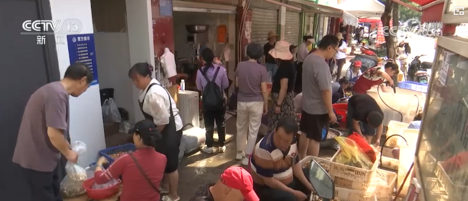 下午四点多,在市场“代洗代炸”的店铺外,工人们正忙着用喷枪清洗菌子,一筐筐待加工的鸡枞高高摞起,不少消费者排队等待。几口正在炸鸡枞的大锅也火力全开,街道里弥漫着浓浓的菌子香。