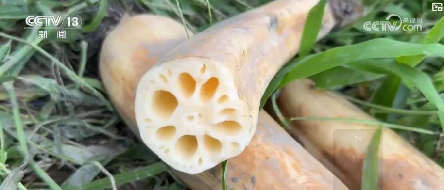 在高压水枪的助力下,莲藕被逐个拽出淤泥,浮出水面。据了解,这片藕塘种植的主要是七孔藕和九孔藕,口感清脆香甜,既能生吃,也可做菜。眼下正值莲藕上市的高峰期,这片一百多亩的藕塘,每天可以产出莲藕三千到五千斤,采摘期可以持续到来年四月。