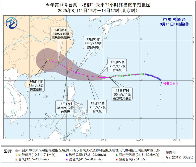 中央气象台8月11日18时对台风“杨柳”的路径和强度预报