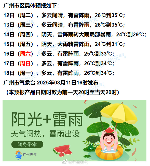 广州市气象台8月11日傍晚市区七天预报 图/新浪微博@广州天气