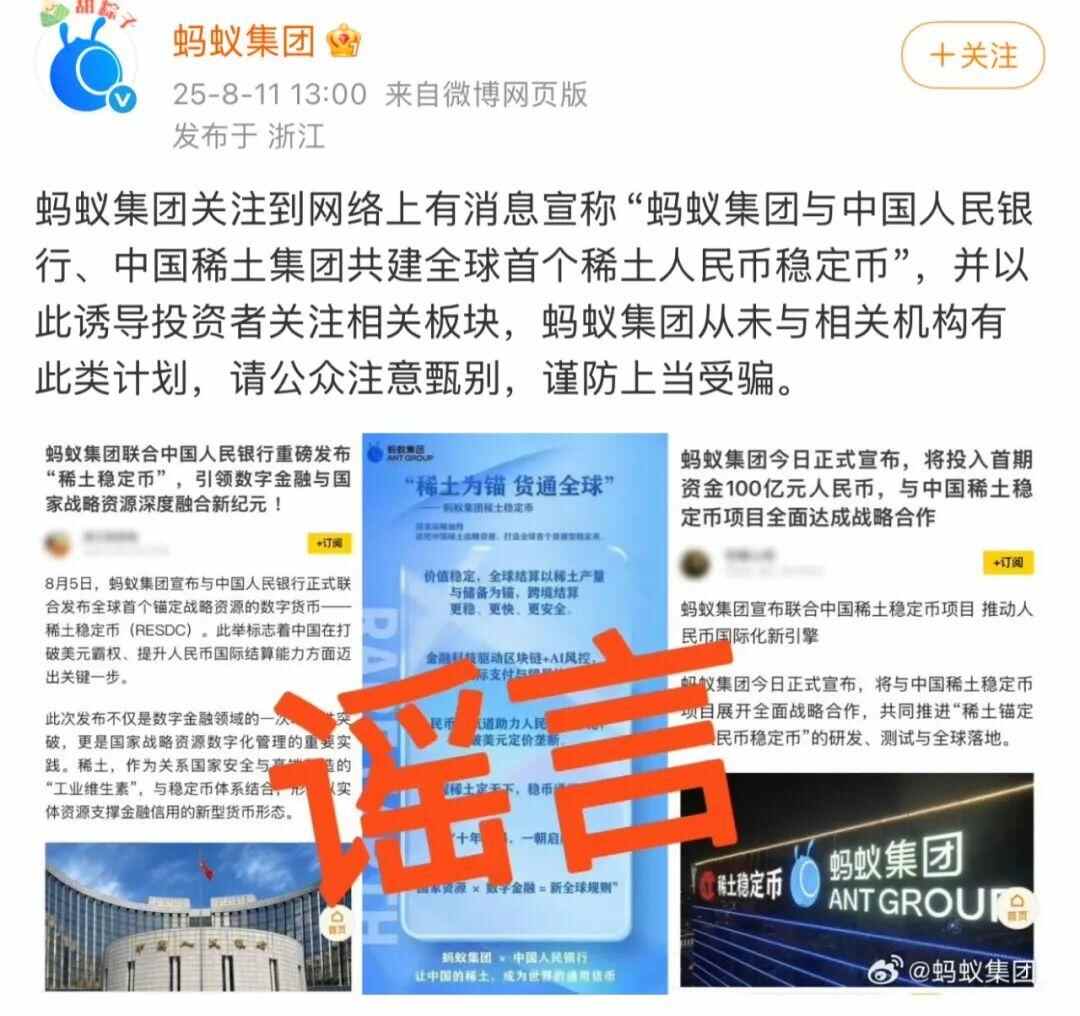 8月11日中午,@蚂蚁集团 发文:蚂蚁集团关注到网络上有消息宣称“蚂蚁集团与中国人民银行、中国稀土集团共建全球首个稀土人民币稳定币”,并以此诱导投资者关注相关板块,蚂蚁集团从未与相关机构有此类计划,请公众注意甄别,谨防上当受骗。