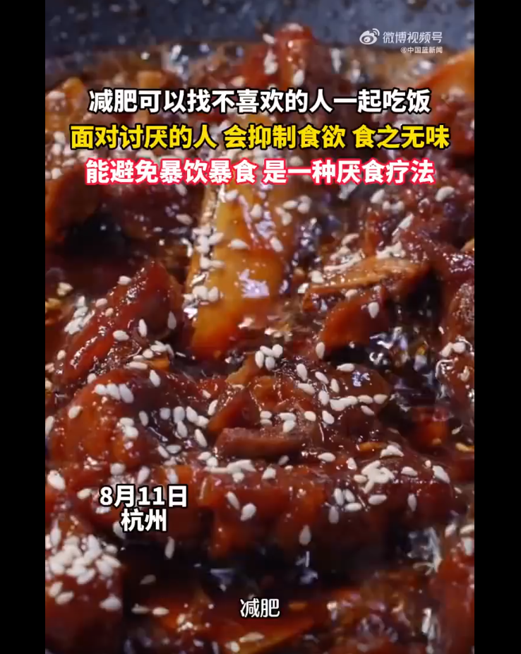 夏季是减肥的黄金时期,浙江省新华医院中医内科主治中医师白洁建议网友,减肥可以找不喜欢的人一起吃饭,面对讨厌的人会抑制食欲,食之无味。能避免暴饮暴食,是一种厌食疗法。