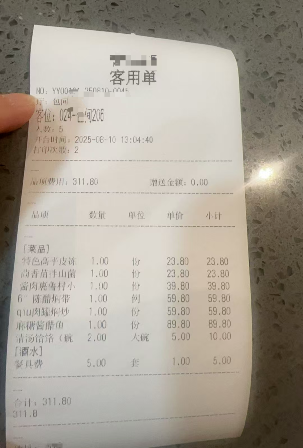 他给记者展示了这些食客的消费账单,点了一份特色高平皮冻23.8元,茴香苗拌山菌23.8元,酱肉裹鲁村39.8元,陈醋焖带59.8元、麻辣酱醋鱼89.8元,清汤饸络5碗10元,肉罐焖炒59.8元以及餐具费5元,共计311.8元的消费。在他看来,这300多元的消费菜单,属于平价消费,并且他们餐馆在当地也是平价餐厅,人均消费就几十元,他不清楚为什么这些人要“逃单”。
