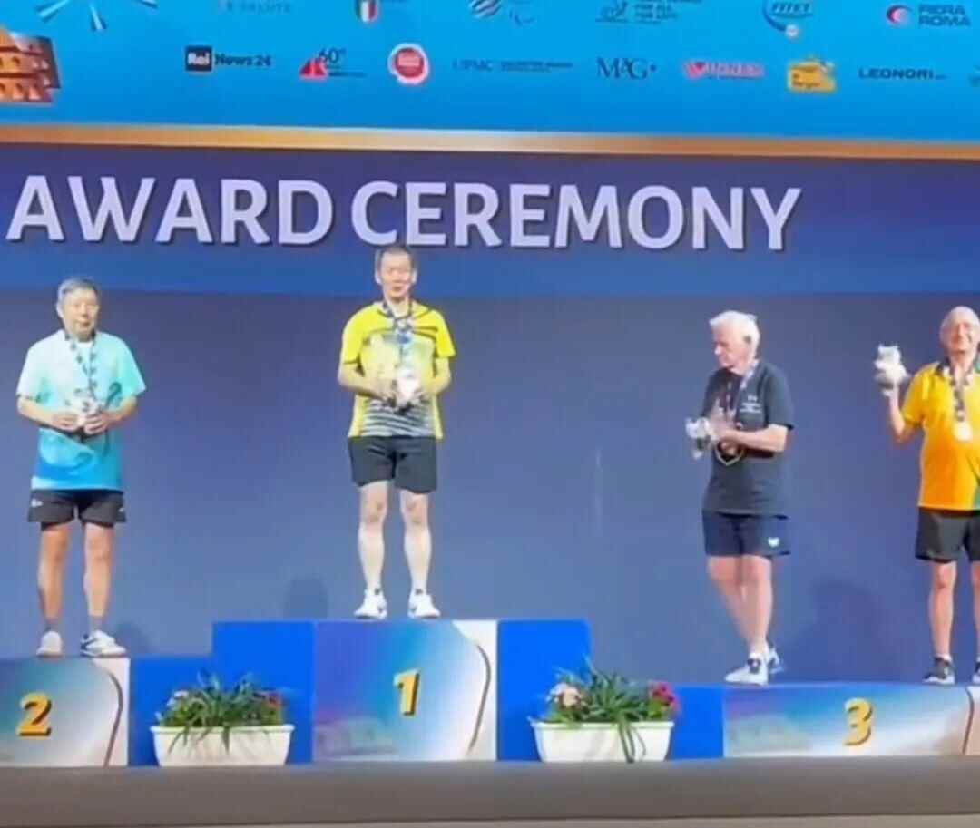 “我在70岁的时候参加了全国红双喜杯乒乓球比赛,2018年在世界元老杯巡回赛美国站夺得双打亚军,后来在2019年的世界元老杯巡回赛深圳站夺得双打冠军。2024在意大利罗马举行的国际乒联第一届大师杯比赛中,我获得80至84岁男子组单打冠军。”