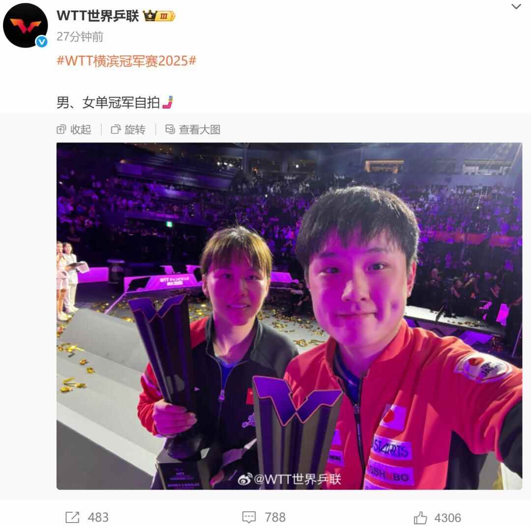 赛后,WTT世界乒联晒出男、女单冠军自拍。