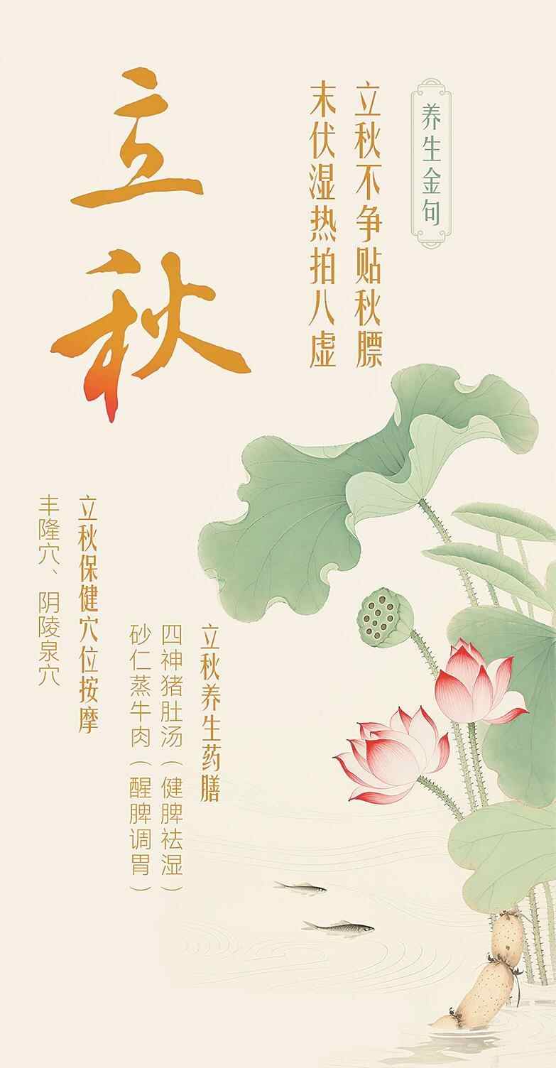 立秋养生可关注这四大穴位:每日按压或艾灸丰隆穴,助化痰湿,尤其适合痰湿内蕴者;每日揉按阴陵泉穴,健脾渗湿,改善小便不利、水肿;掐按合谷穴,解表清热,预防空调病引起的头痛、鼻塞;睡前按摩三阴交10分钟,可调经安神、舒缓情绪。