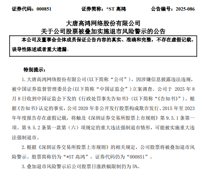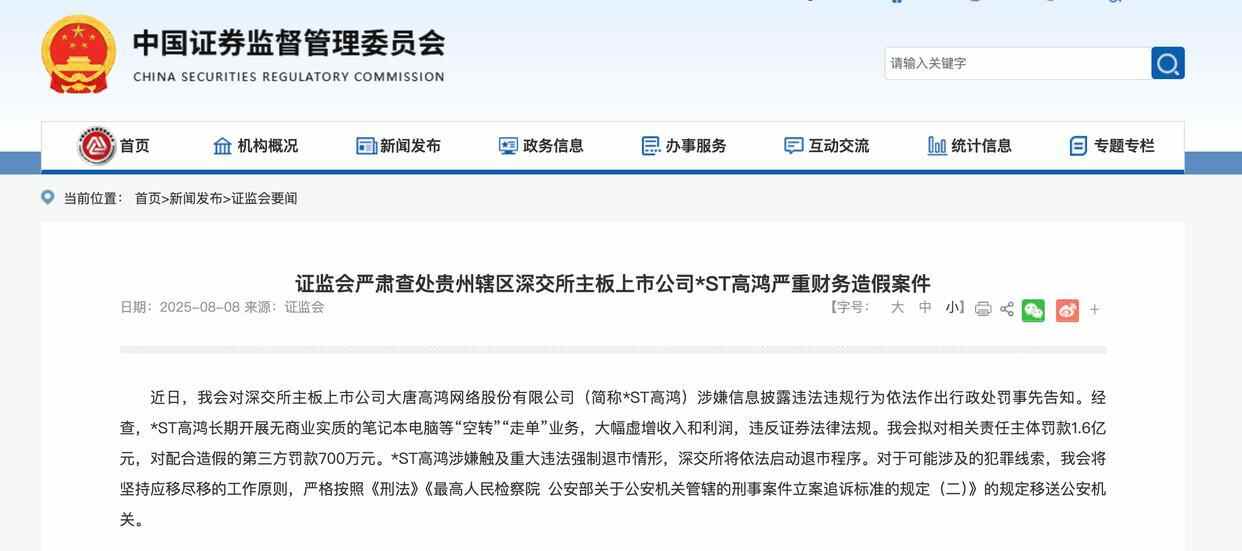 8月8日,证监会称,近日对深交所主板上市公司大唐高鸿网络股份有限公司(以下简称“*ST高鸿”)涉嫌信息披露违法违规行为依法作出行政处罚事先告知,拟对相关责任主体罚款1.6亿元,对配合造假的第三方罚款700万元。