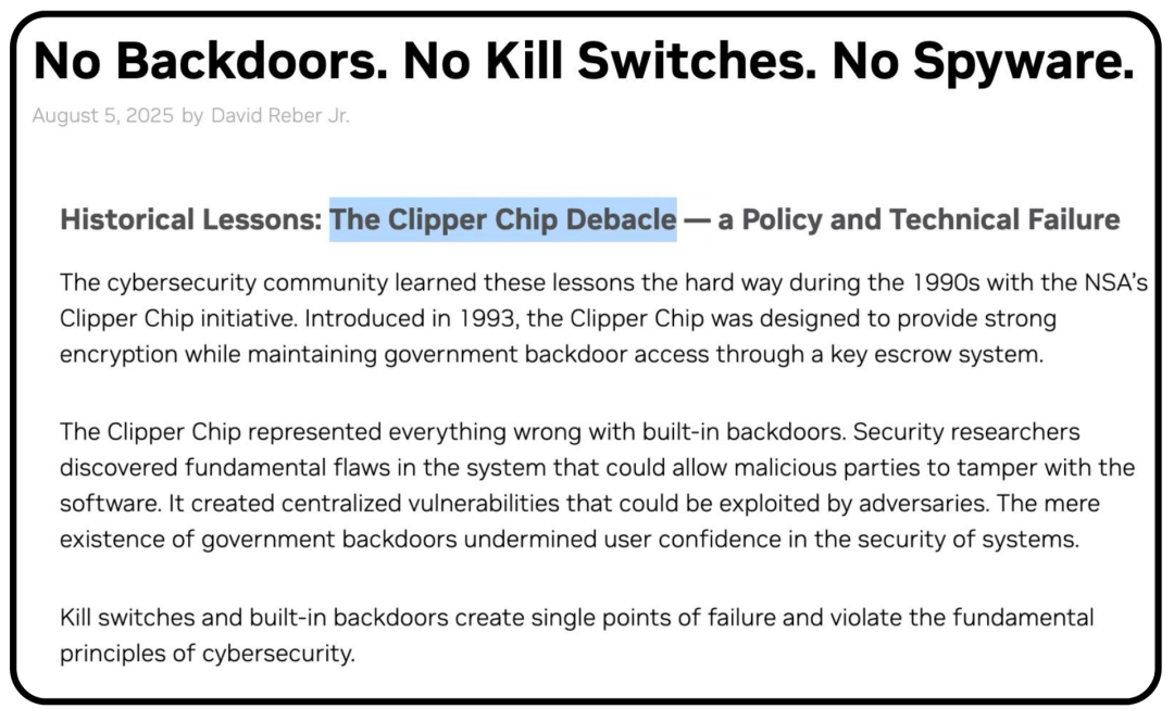 英伟达在随后的自辩声明中提到,芯片没有“后门”,他们还专门提到了“Clipper芯片”事件。