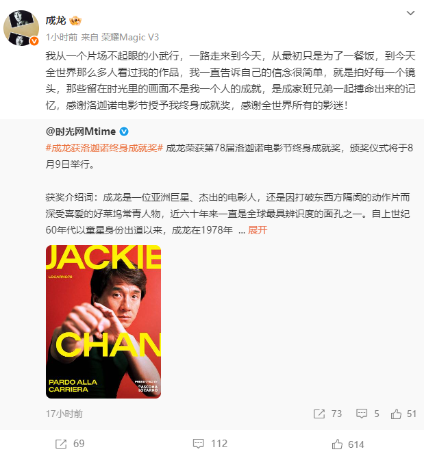 成龙写道:“我从一个片场不起眼的小武行,一路走来到今天,从最初只是为了一餐饭,到今天全世界那么多人看过我的作品,我一直告诉自己的信念很简单,就是拍好每一个镜头,那些留在时光里的画面不是我一个人的成就,是成家班兄弟一起搏命出来的记忆,感谢洛迦诺电影节授予我终身成就奖,感谢全世界所有的影迷!”
