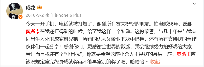 当年获得奥斯卡终身成就奖后,成龙曾发文:“拍电影56年,感谢奥斯卡在我还打得动的时候,给了我这样一个鼓励。这份荣誉,与几十年来与我共同出生入死的成家班兄弟,所有的优秀又敬业的戏中搭档,还有所有支持我的合作伙伴们一起分享!感谢你们,更感谢全世界的影迷,我会继续努力拍好戏给大家看!而且我还有个‘小目标’,那就是希望这座小金人不是我的最后一座,奥斯卡应该没规定拿完终身成就奖就不能再拿别的奖了吧。”