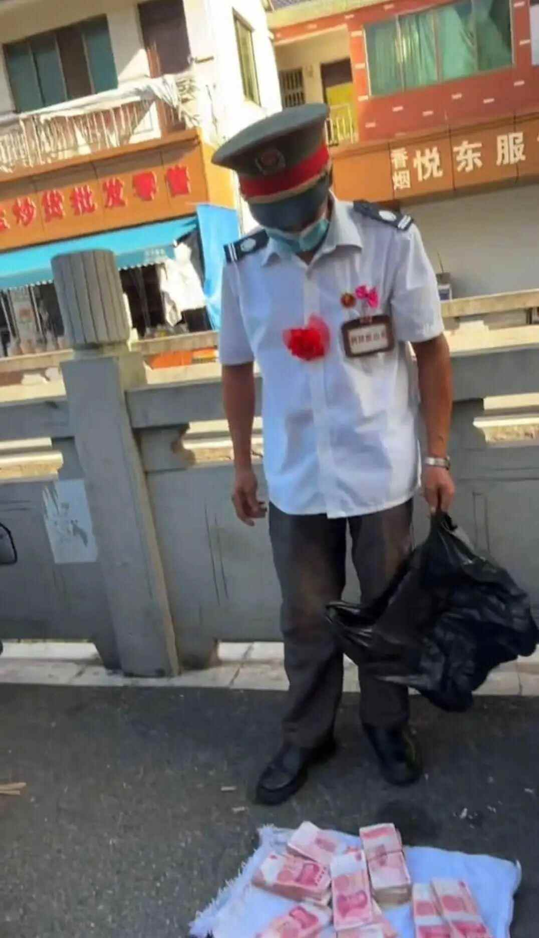 8月7日,一网友发布视频,浙江省诸暨市枫桥镇一菜市场附近,有一大爷疑似拿着大量现金摆摊。视频中,一名穿着白色制服的男子站在路边,胸口挂着写有派出所名字的牌子,手里拿着一个黑色塑料袋,在他身前摆着十几沓疑似钞票的纸张。此举引发不少路人围观。