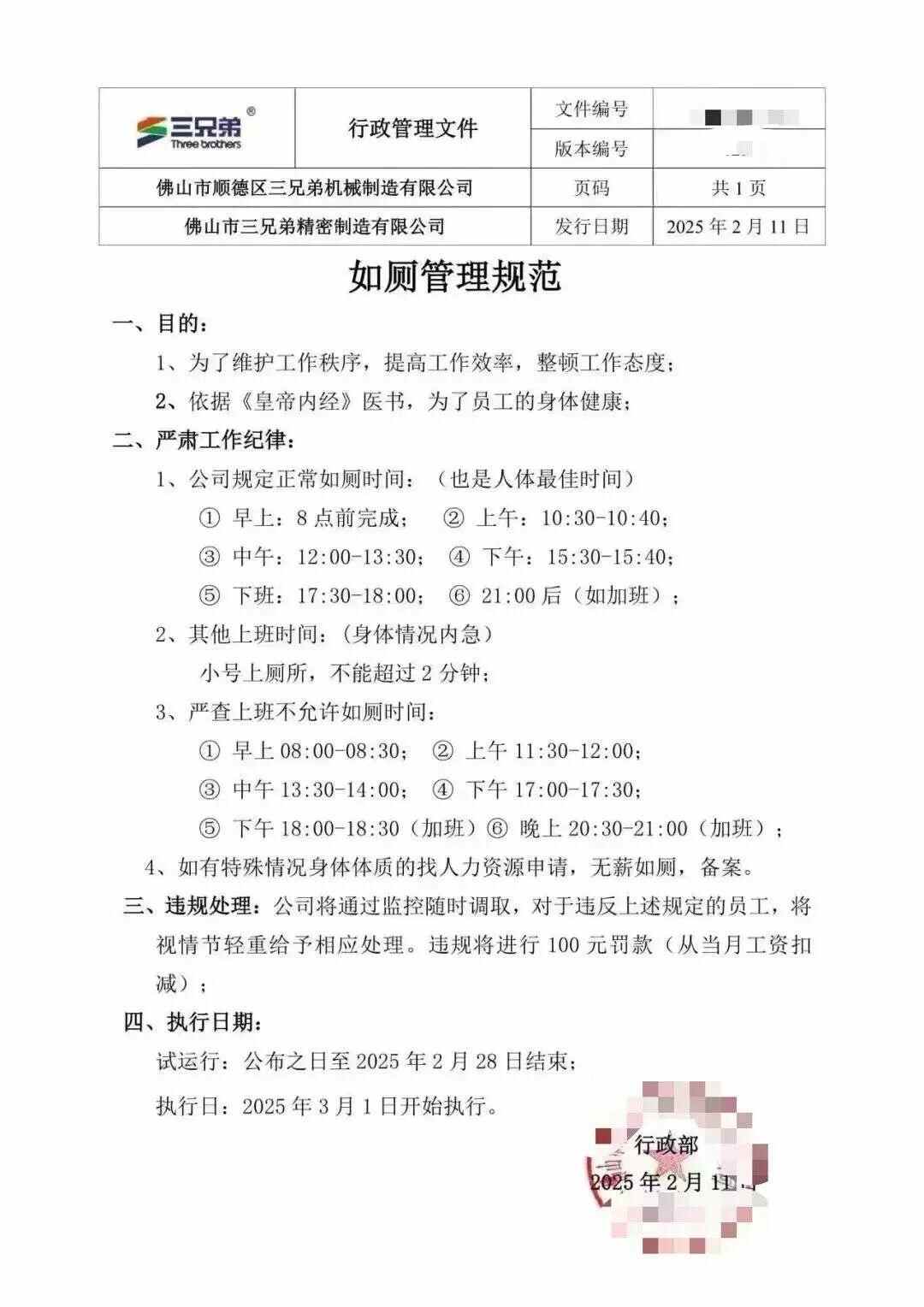 公司要求员工上厕所报备的情况并非首次出现。今年3月,广东佛山市顺德区三兄弟机械制造有限公司发布的《如厕管理规范》(以下简称“规范”)在网上传播,引发关注。