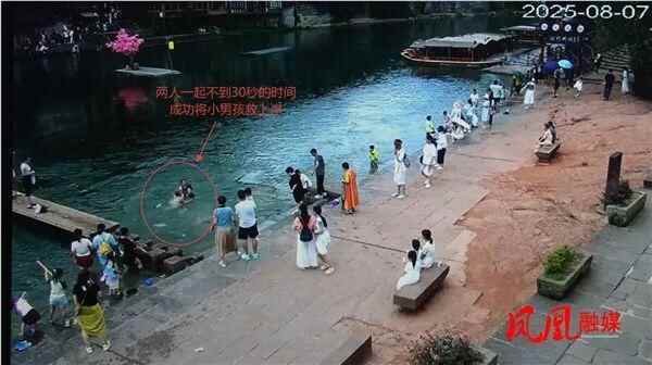 8月7日中午,在凤凰古城景区北门码头附近,一名小男孩在沱江岸边玩水时,突然落水被水冲走。在千钧一发之际,一位外国女游客毫不犹豫地跳入水中,成功将小男孩救上岸。