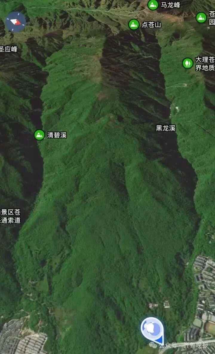 志愿者向记者发来了男童失踪地点的地理卫星图:到处是山脉和植被覆盖。志愿者称,男童失踪的地点大致在这一带。