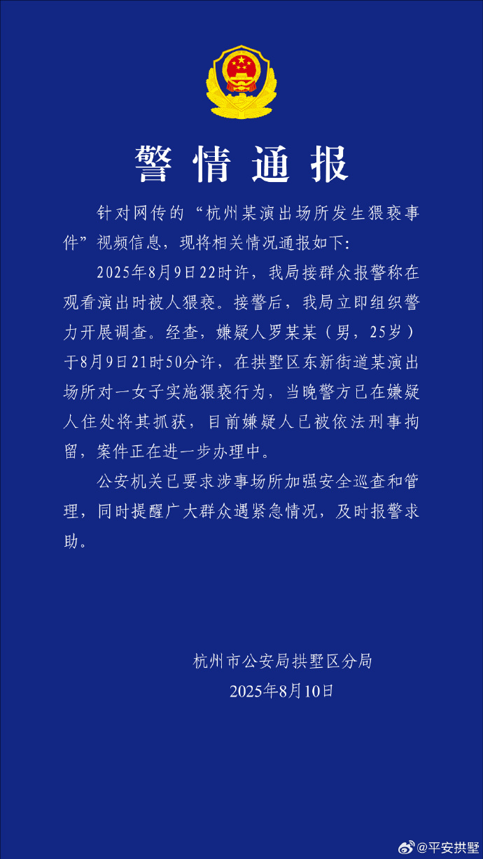 2025年8月9日22时许,我局接群众报警称在观看演出时被人猥亵。接警后,我局立即组织警力开展调查。经查,嫌疑人罗某某(男,25岁)于8月9日21时50分许,在拱墅区东新街道某演出场所对一女子实施猥亵行为,当晚警方已在嫌疑人住处将其抓获,目前嫌疑人已被依法刑事拘留,案件正在进一步办理中。
