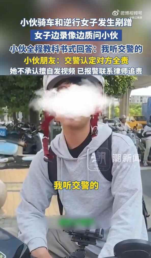 据钱江晚报报道,近日,苏州一小伙骑车时与逆行女子发生剐蹭,女子拿出手机边拍摄边质问小伙,“你是怎么活到现在的”“你撞到我没关系是吧”;小伙全程教科书式回答,“我听交警的,以交警处理结果为准,至于撞没撞到你,我听交警的”。