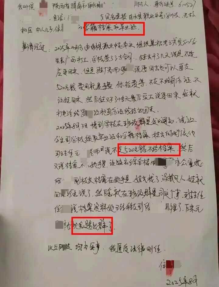 侯某某在举报信中称,2025年4月,白水职业中专组织已参加单招考试的学生去外省打工(实习),签了合同。他儿子干了几天后不适应,想回家。驻厂老师罗某提出,回家前需支付520元的车费、体检费,否则不给身份证。侯某某说,“孩子干了十多天,又说要回家。我联系罗某,让他把身份证给孩子,让孩子回家。”