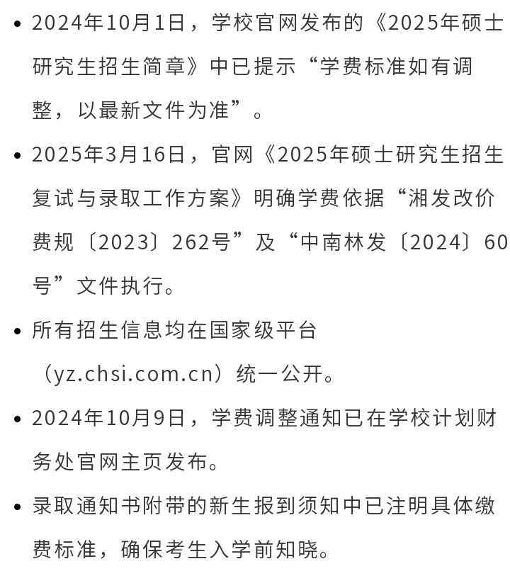 此外,学校在2025年3月16日公布的《中南林业科技大学2025年硕士研究生招生复试与录取工作方案》中再次提及了前述学费调整文件。