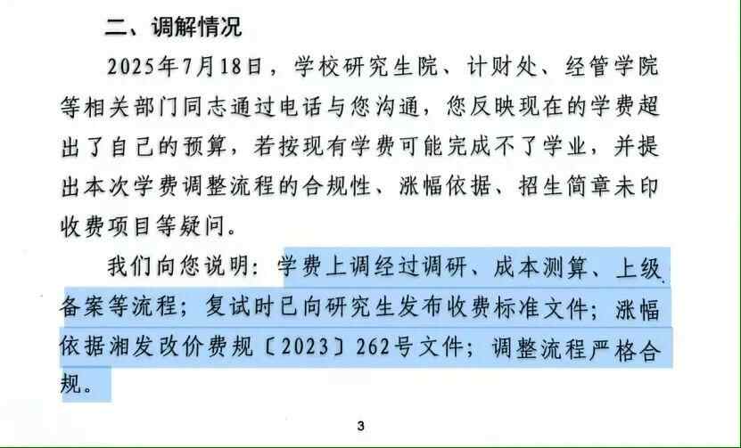 2025年7月11日,学生们向湖南省信访局反映问题。7月18日,他们收到了校方回应。中南林业科技大学表示,学费上调经过调研、成本测算和上级备案等流程,且涨幅依据“湘发改价费规〔2023〕262号”文件,调整流程严格合规。