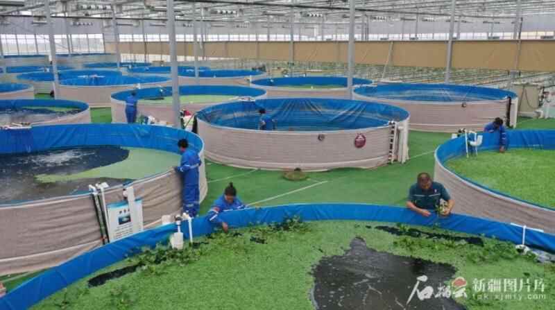 柯坪县绿色戈壁设施农业产业园,养殖区直径7米的圆形池饲养着罗氏沼虾和大闸蟹。 柯坪县融媒体中心供图