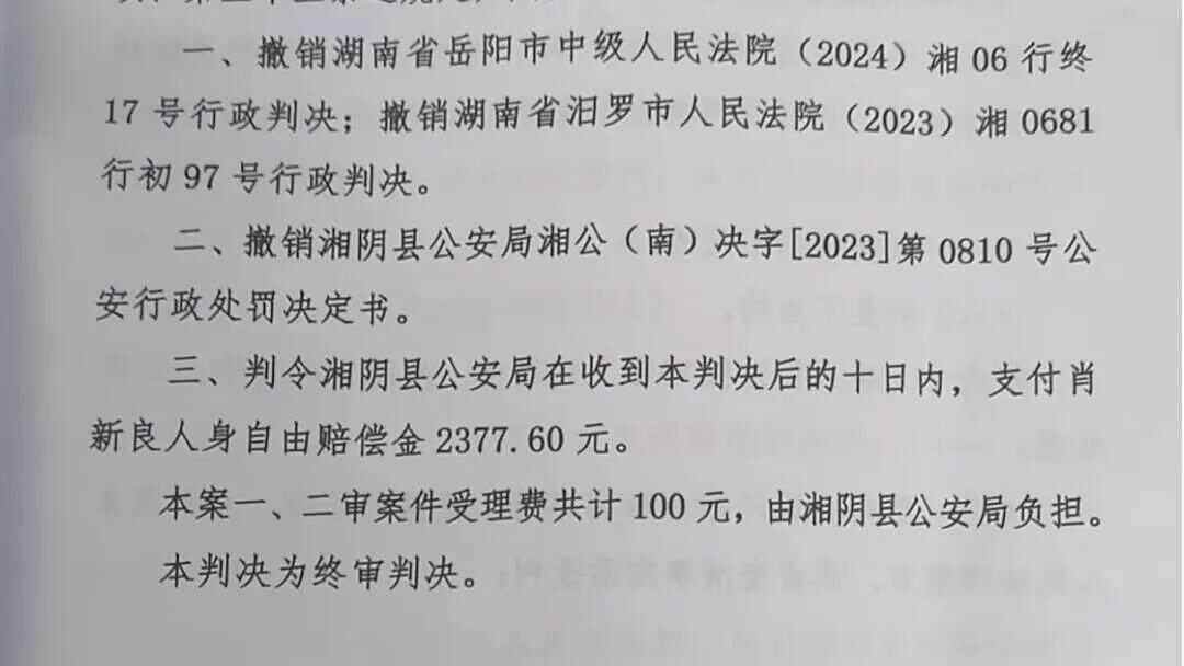 2025年6月25日,湖南省高级人民法院就本案做出判决:“原一、二审判决主要证据不足,适用法律错误,应予撤销。”至此,肖新良曾接受的行政处罚被撤销,并获赔人身自由赔偿金。