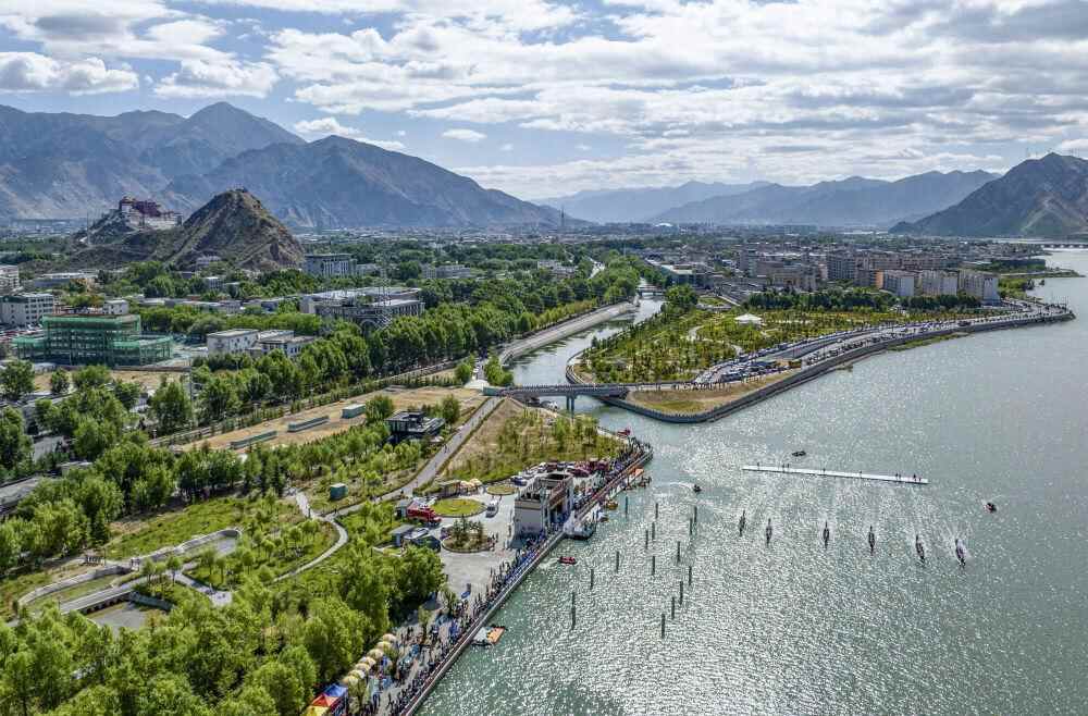 ↑在西藏自治区拉萨市,参赛队伍在“2024年西藏自治区端午节牛皮船(龙舟)赛”中(2024年6月9日摄,无人机照片)。