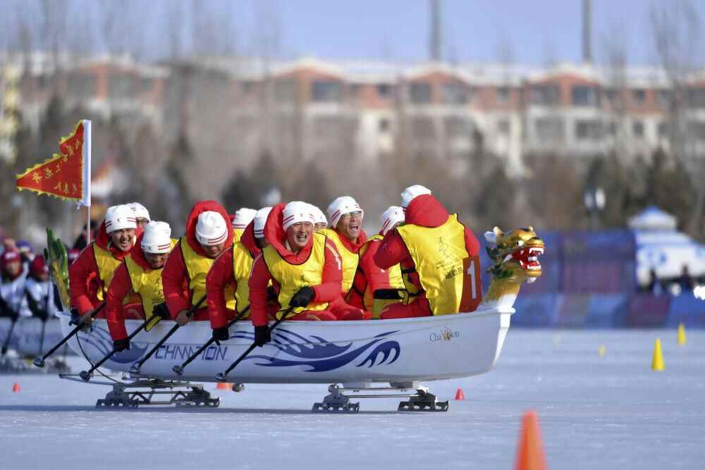 ↑在内蒙古自治区锡林郭勒盟举行的第十四届全国冬季运动会群众体育冰上龙舟项目中,冠军内蒙古队在男子组(12人)龙舟200米直道赛决赛中(2020年1月12日摄)。