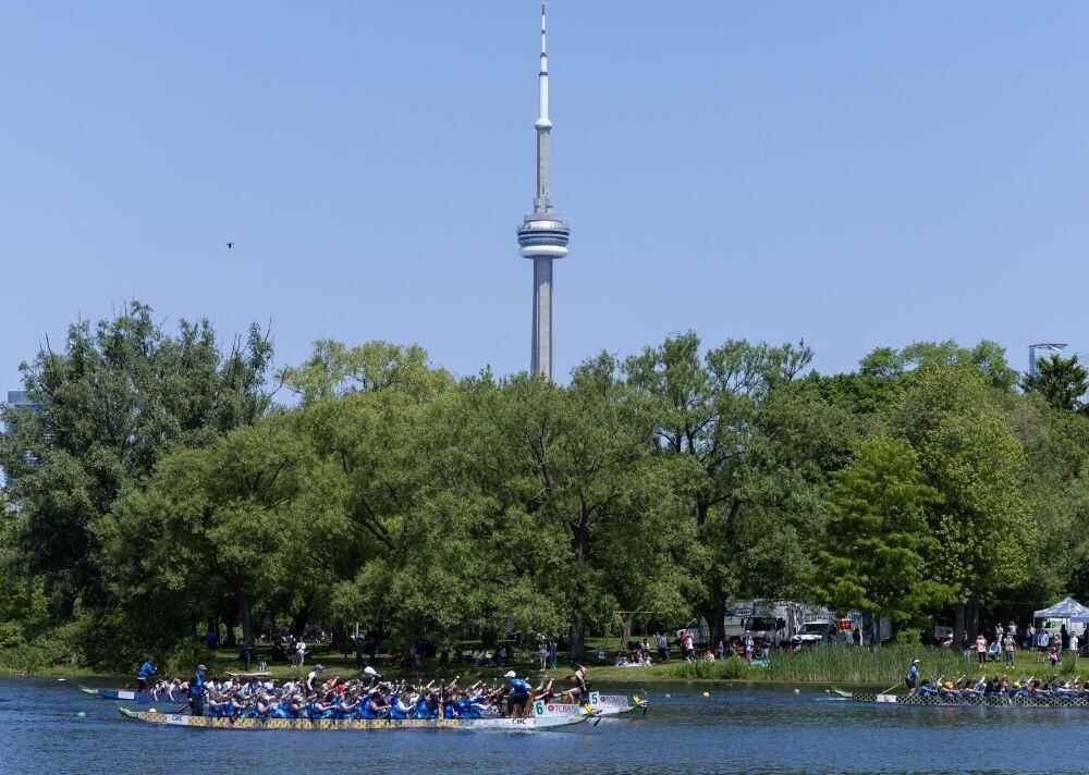 ↑在加拿大多伦多,选手们在2025年国际龙舟节上竞渡(2025年6月14日摄)。