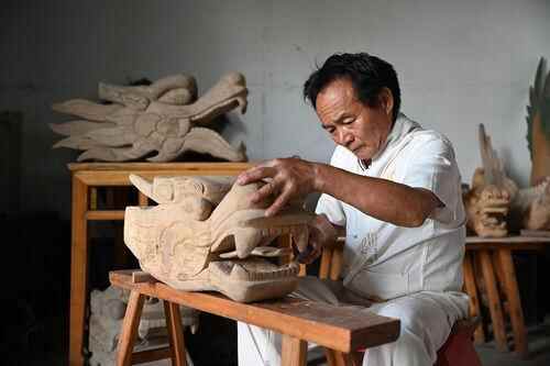 ↑湖南省汨罗市屈子祠镇九子龙屈原龙舟厂内,许桂生正在雕制龙头(2020年6月13日摄)。