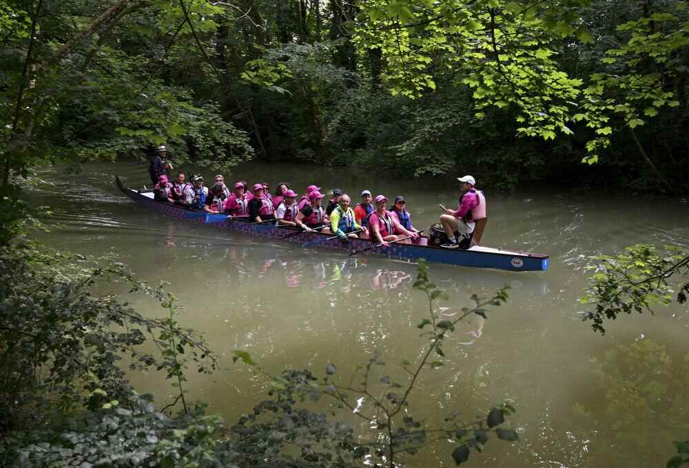 ↑在法国香槟沙隆,“冠军龙女”龙舟队在马恩河上训练(2024年7月7日摄)。