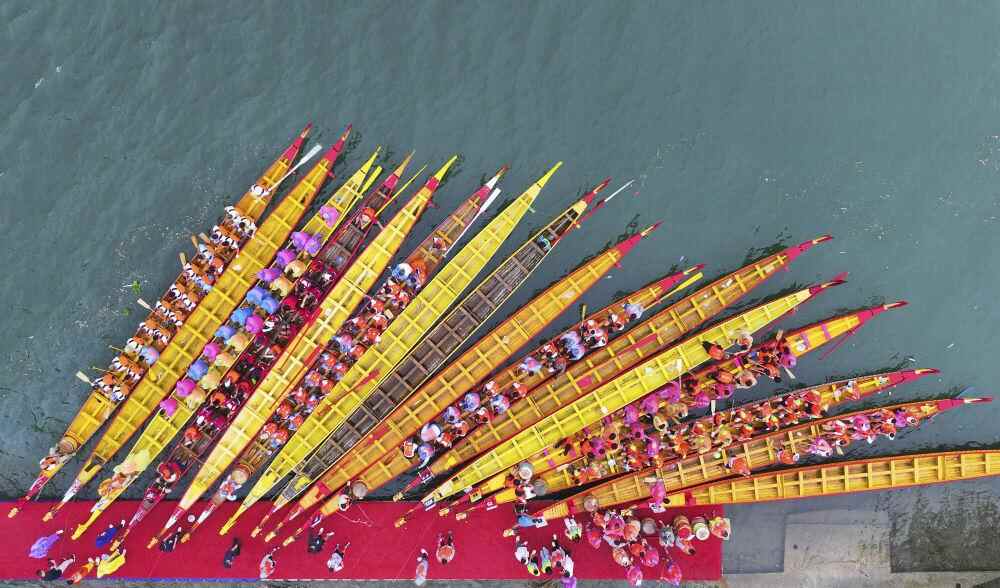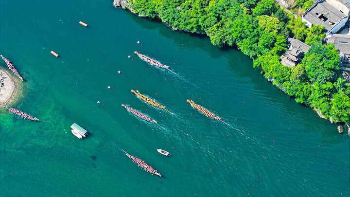 ↑在安徽省宣城市泾县桃花潭镇,数支龙舟队在参与当地举办的龙舟赛,迎接端午节的到来(2025年5月30日摄,无人机照片)。