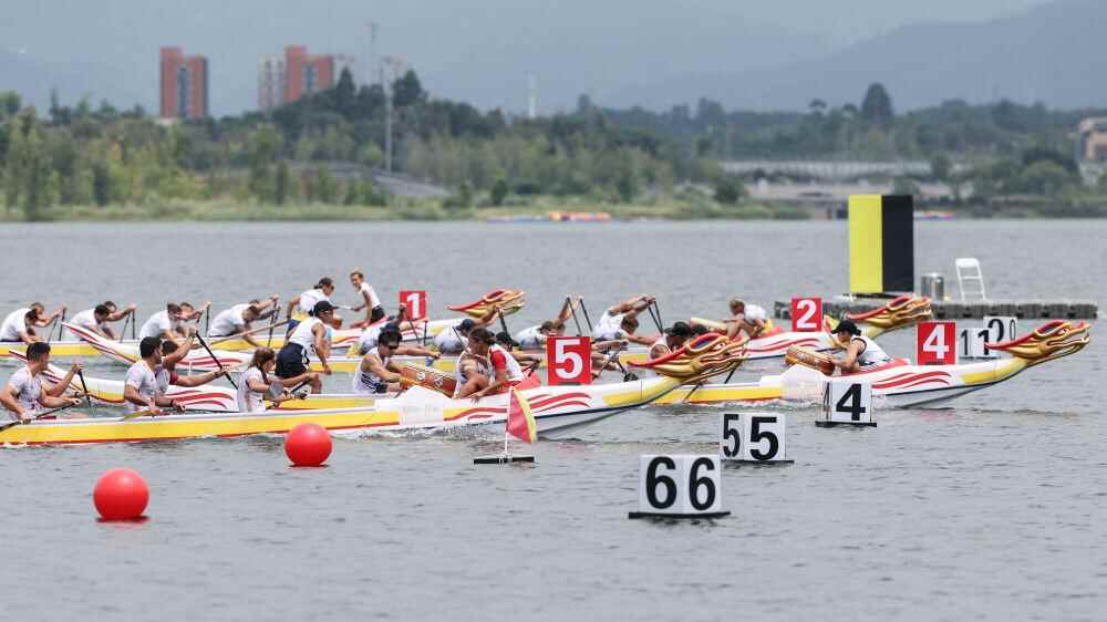 ↑在成都兴隆湖湖滨赛场,选手们在2025年成都世运会龙舟8人座公开组200米半决赛比赛中(8月9日摄)。