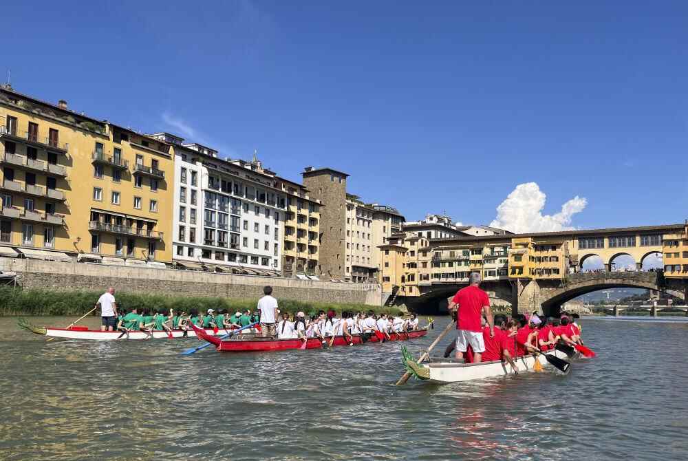 ↑在意大利佛罗伦萨,选手们在阿诺河上参加龙舟比赛(2025年5月31日摄)。