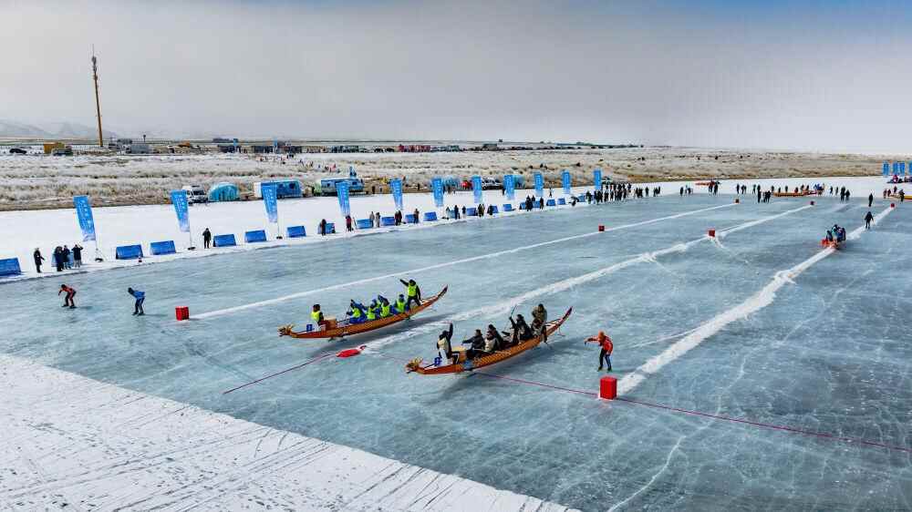 ↑在新疆博尔塔拉蒙古自治州,选手们参加“首届赛里木湖全国冰上龙舟邀请赛”(2025年3月15日摄,无人机照片)。