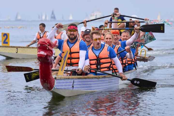 ↑在俄罗斯符拉迪沃斯托克,选手为获得龙舟比赛胜利欢呼(2025年6月29日摄)。