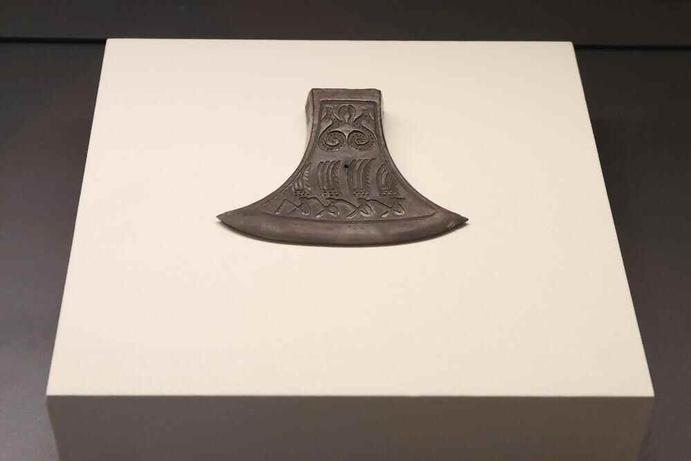 ↑图为“羽人竞渡纹铜钺”(复制品)。