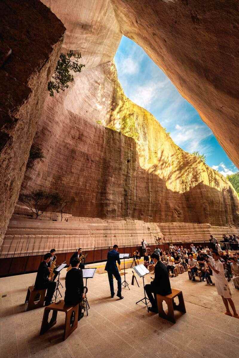 9号岩宕则是另一番境界。形似巨大的“喇叭口”,它天然具备优越的声学效果,被改造为舞台与人文讲堂。雨天,雨水从高处滴落,敲响回声的鼓面;晴日,婺剧、萨克斯、小型音乐会在此上演,山鸣谷应之间,观众沉醉其间。