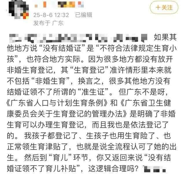 该网友进一步表达了对上述回复的不解,因为根据《广东省人口与计划生育条例》和《广东省卫生健康委员会关于生育登记的管理办法》,明确了非婚生育可以办理生育登记。“我也是依法登记了的。我孩子都登记了,生孩子也用生育险了,也正常领生育津贴了,也就是说全流程认可了她的出生。”