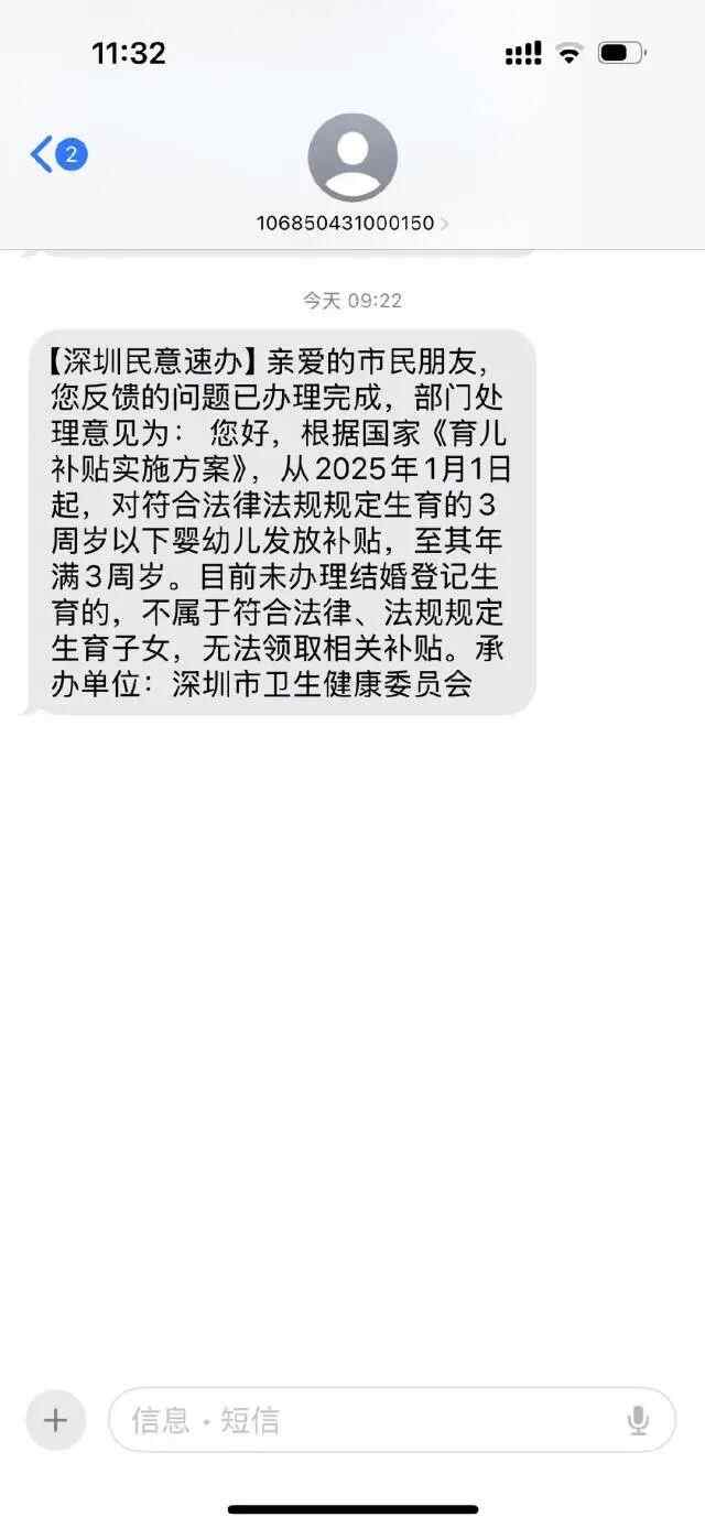 8月6日,有网友发文反映称,自己收到深圳卫生健康委短信告知,因其未办理结婚登记生育,不属于符合法律、法规规定生育子女,无法领取相关育儿补贴,相关帖文立即引起网友热议。