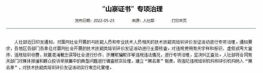 人社部此前一直在进行“山寨证书”的专项治理行动,考试中心联合有关部门持续加大对“山寨证书”的打击力度,对发现的假冒网站等线索,坚持一查到底、深挖彻查。