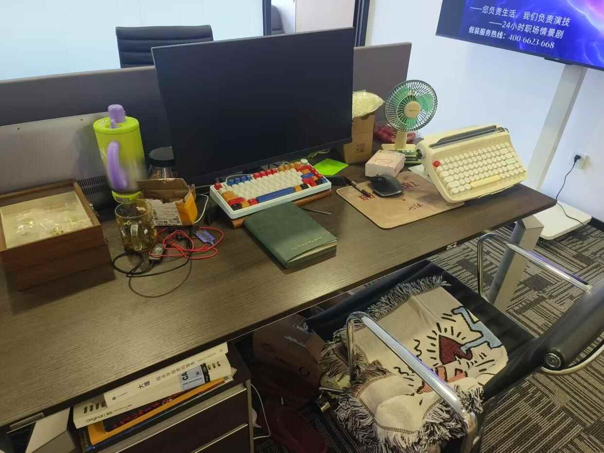 老艾则在工位上寄存了自己的生活。她来的时间最长,得到了150元一个月的优惠价格,工位被她装饰得很有生活气息——她的桌子底下有三四个未拆的快递盒子,桌子上有两块奶油色的键盘、复古小风扇、未拆封的超级密码机、一摞书,《喜剧的艺术》《段永平投资问答录》《开始写歌》。